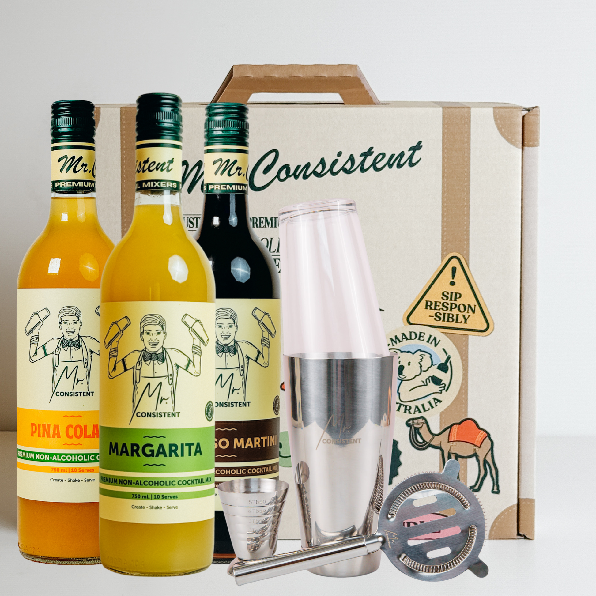 Mr. Consistent Signature Sips Gift Pack – Espresso Martini, Classic Margarita & Piña Colada + FREE Essential Shaker